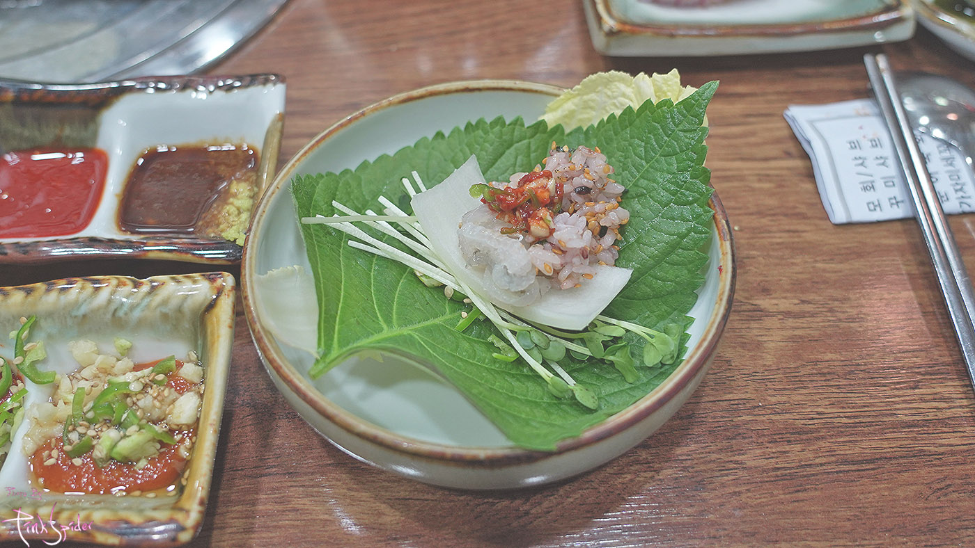 살짝 양념된 밥에, 무순, 거의 통짜수준의 생양파 그리고 세꼬시처럼 잘게 썰은 참가자미회 구성이다.