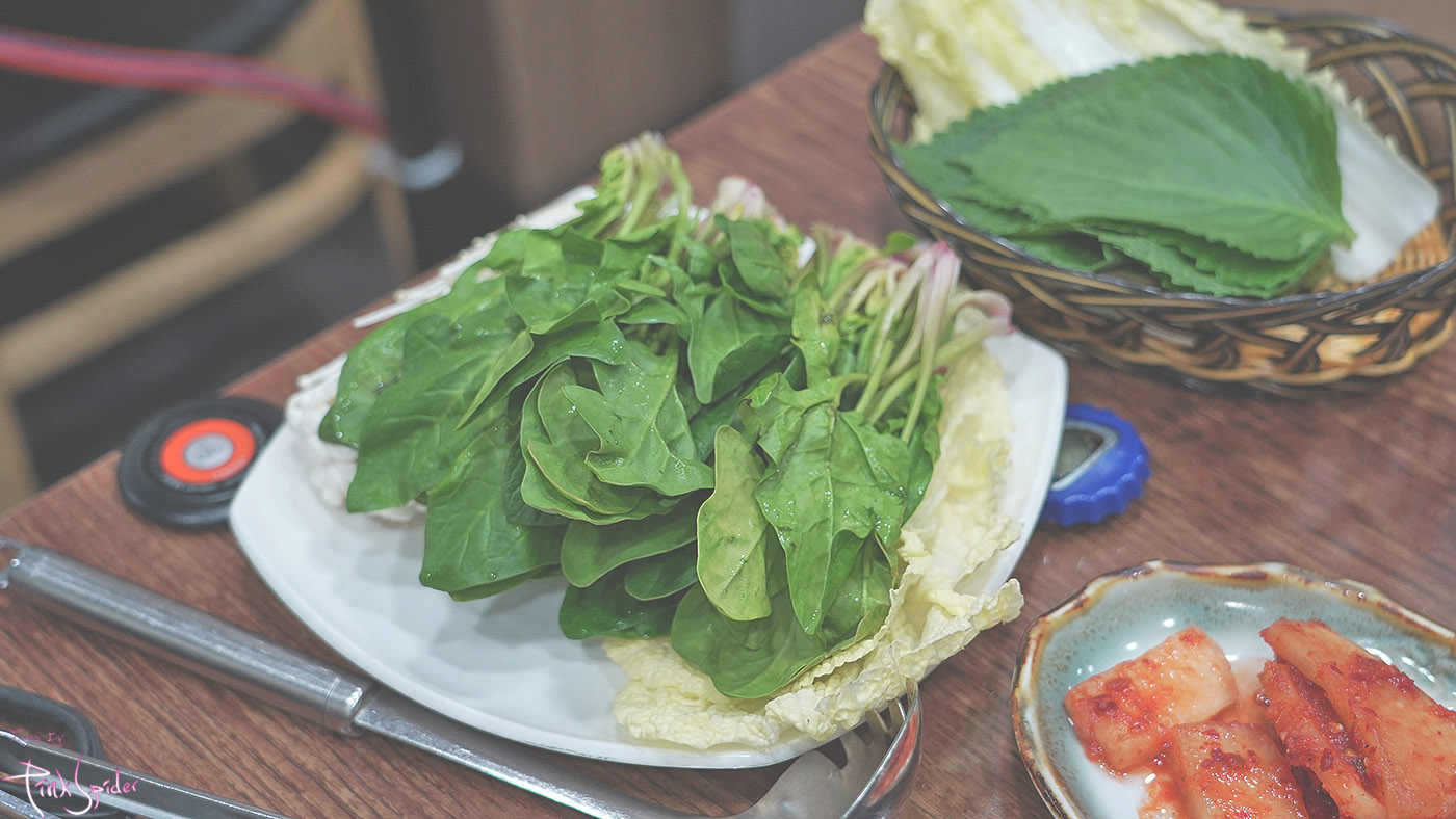 같이 올려서 먹을 싱싱한 배추랑 깻잎도 나오고