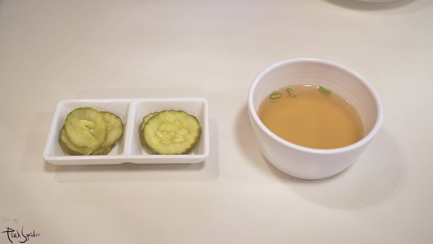 기본찬은 피클에 무난한 우동국물(이라고 해야 하나?)