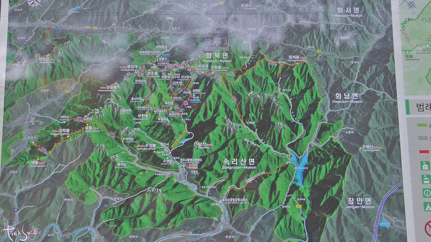 여기서 왼쪽으로 올라가서 문장대를 거쳐서 천왕봉까지 갔다가 오른쪽으로 내려오면 되는데