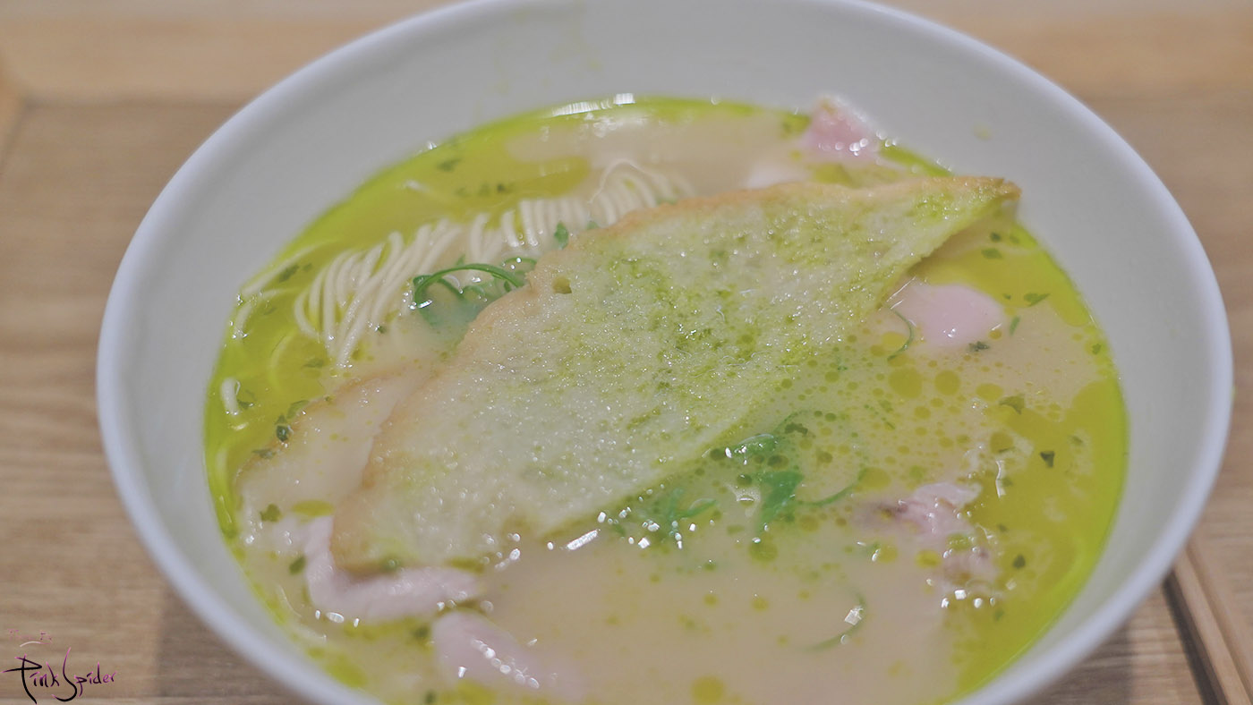 니시무라멘 교카이 파이탄 라멘에는 독특하게 얇게 썰은 바게트 빵이 들어가는데