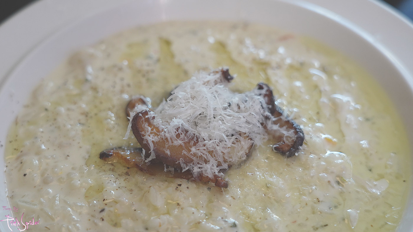 그 위에 적당하게 잘 구운 버섯에 갈은 치즈가 올려져 있었는데
