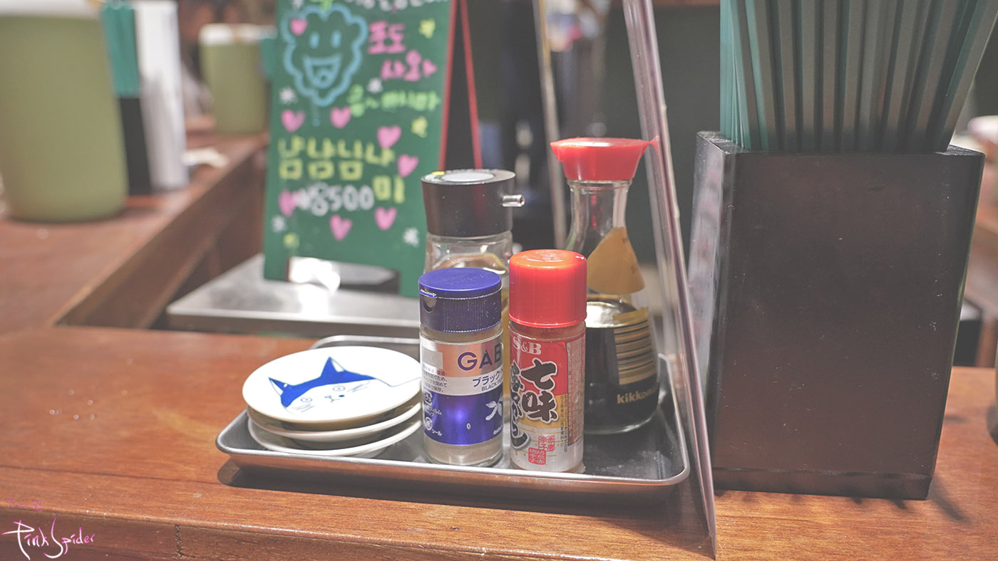 간장, 다시마 식초, 후추 그리고 시치미가 있고