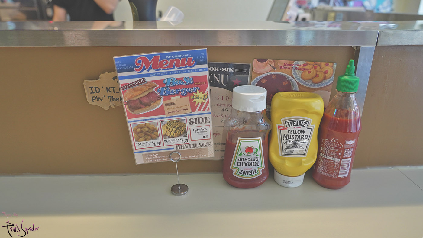 버거에 곁들일 수 있는 소스는 케찹, 머스타드 소스 그리고 타이 스리라차 소스가 있다.