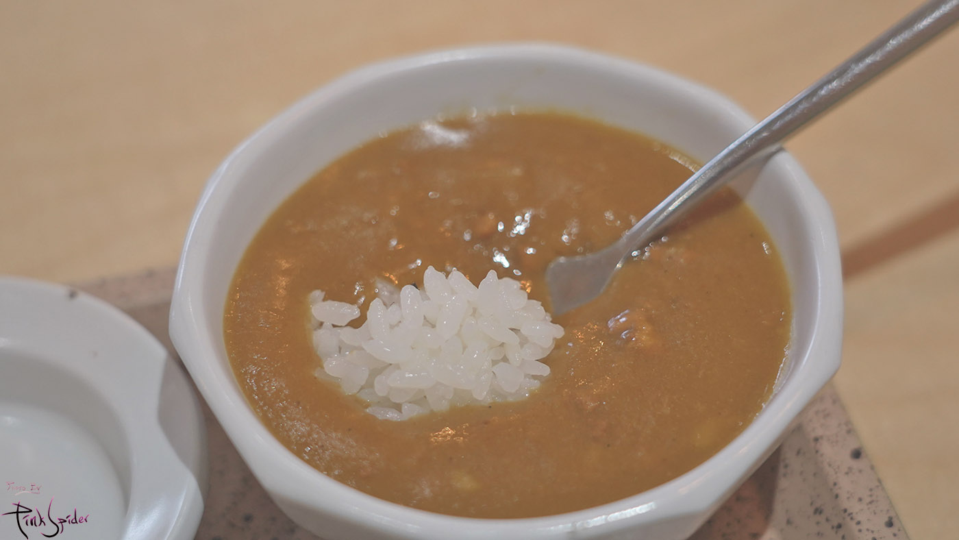 카레는 드라이 카레 타입은 아니고 묽은 일반적인 카레 식감이다.