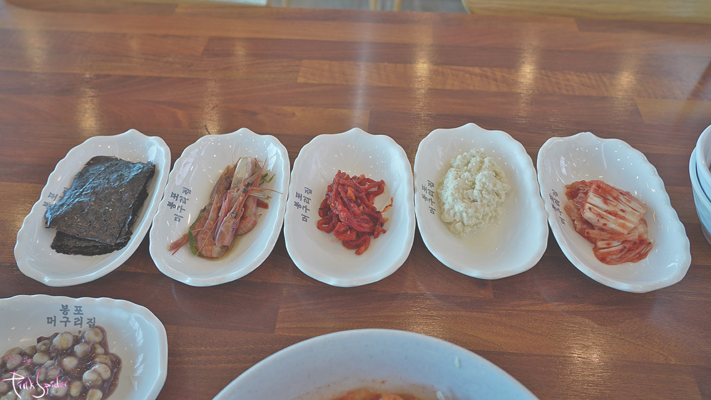 물회를 싸서 먹을 수 있는 김, 적당히 간이 된 새우장, 단맛없이 살짝 칼칼한 무말랭이 무침, 두부 그리고 김치