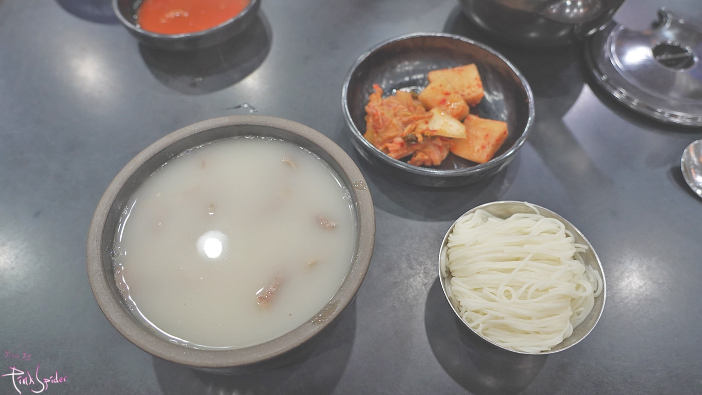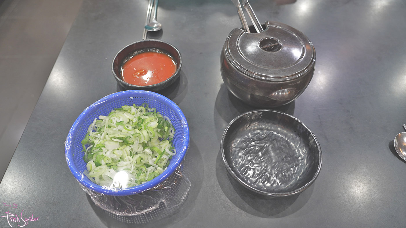 주문을 하면 잘게 썰은 대파를 담은 작은 소쿠리, 김치국물, 앞접시 그리고 김치와 석박지 단지가 나온다.
