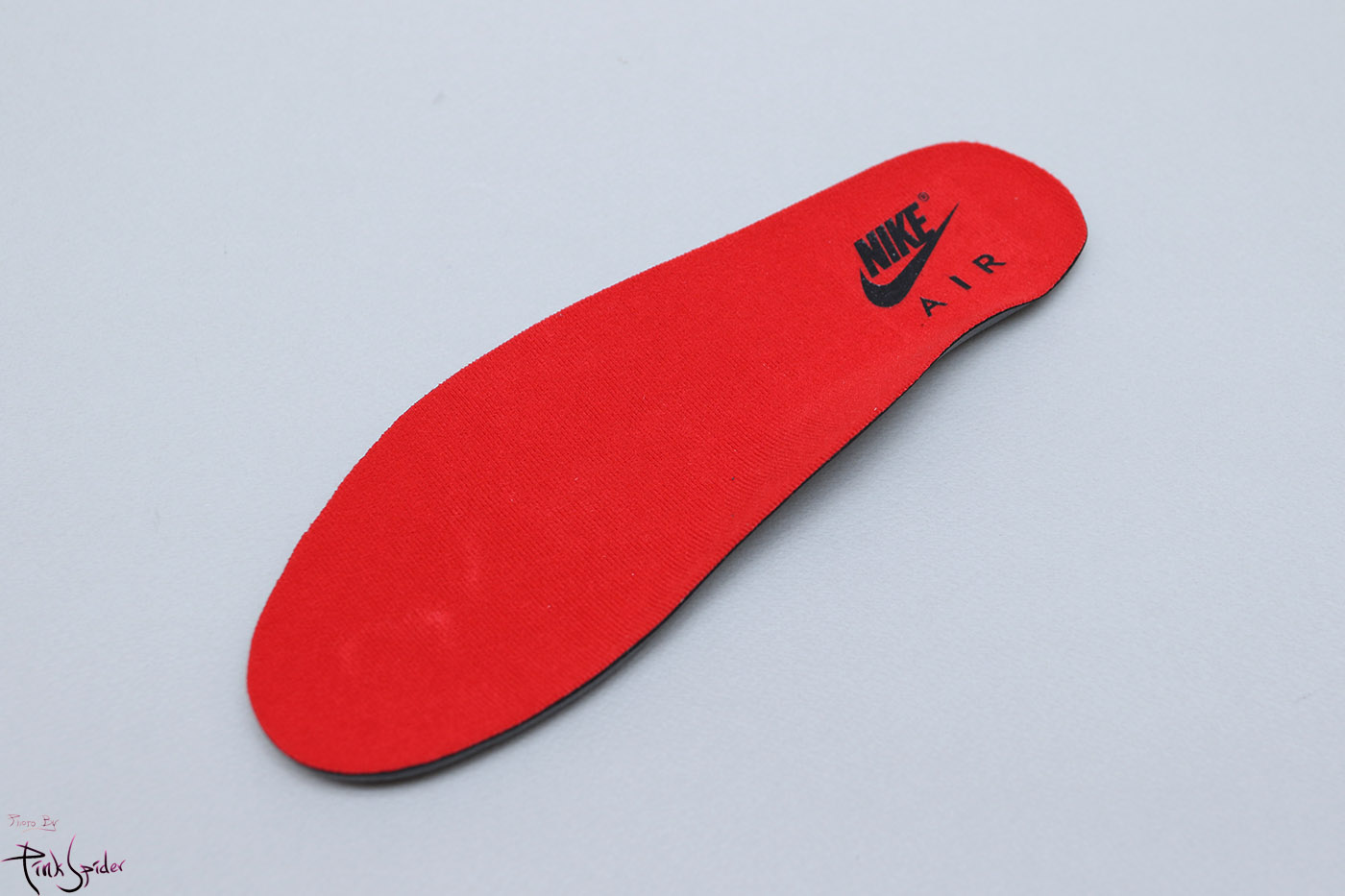 깔창은 신형 조던 깔창이고 아주 강렬한 레드컬러에 뒷축에 블랙으로 나이키 로고가 프린팅 되어 있다.