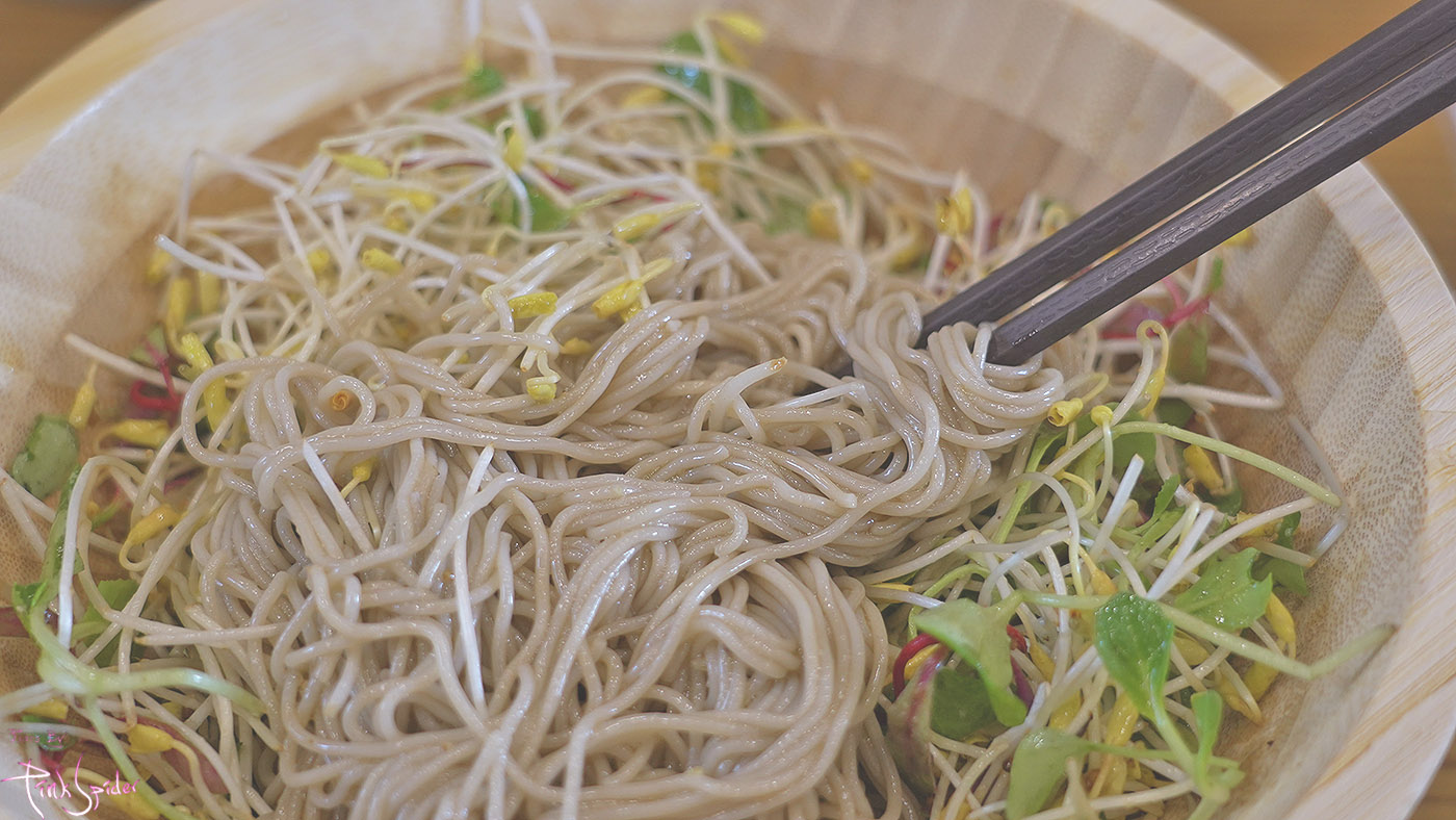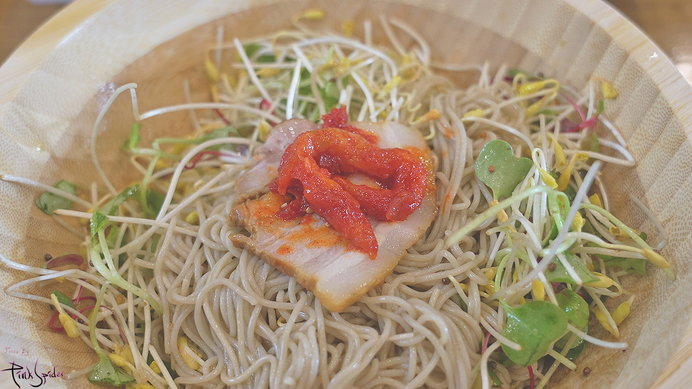 강한 맛의 소스를 사용하지 않아서 새싹들의 맛과 메밀면 맛 자체를 있는 그래도 즐길 수 있는 메뉴더라.
