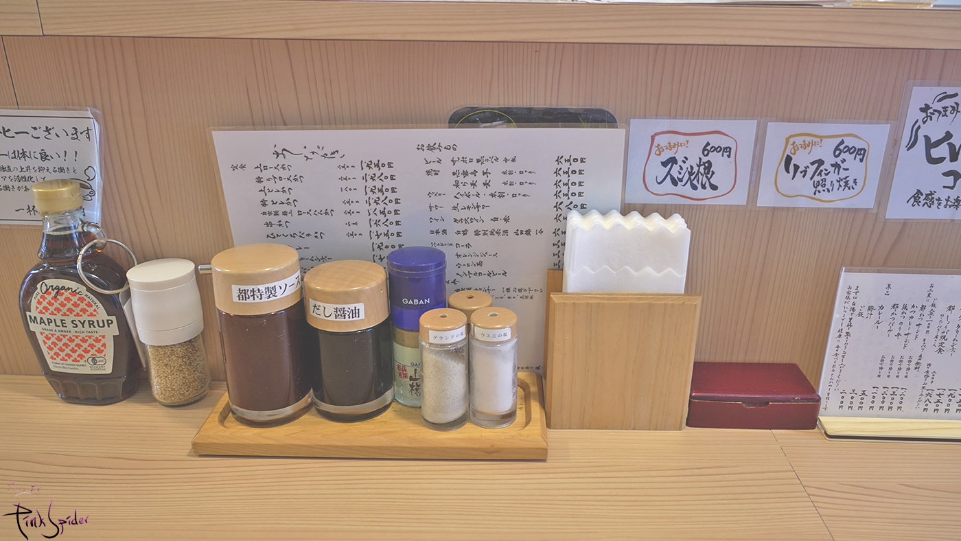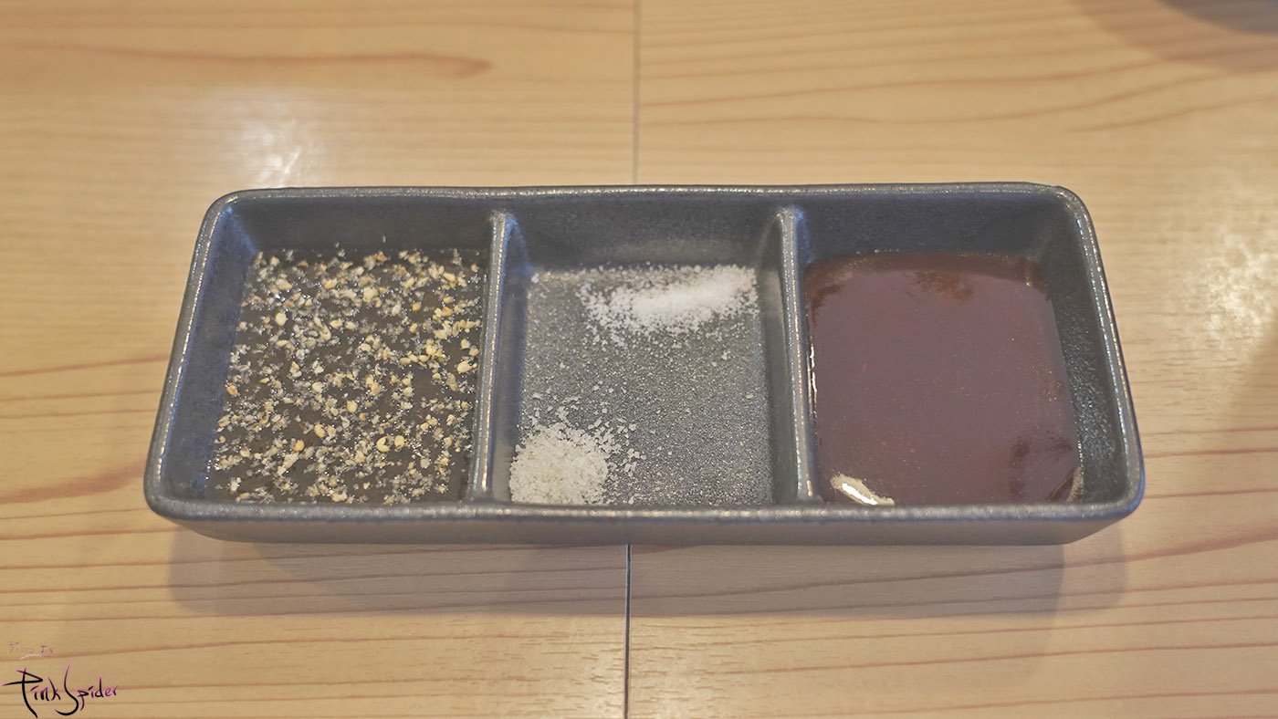미야코 특제소스, 다시쇼유, 후추, 게랑드 소금, 우유니 소금에 아마 하나는 핑크솔트였던 것 같고