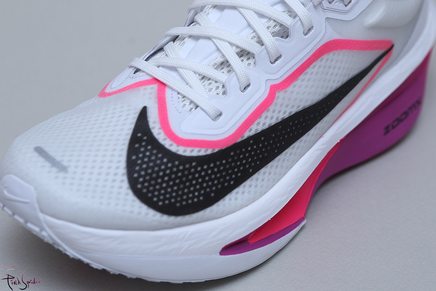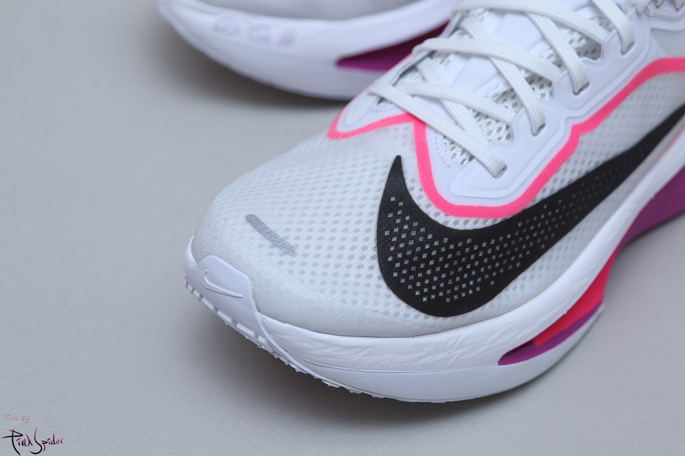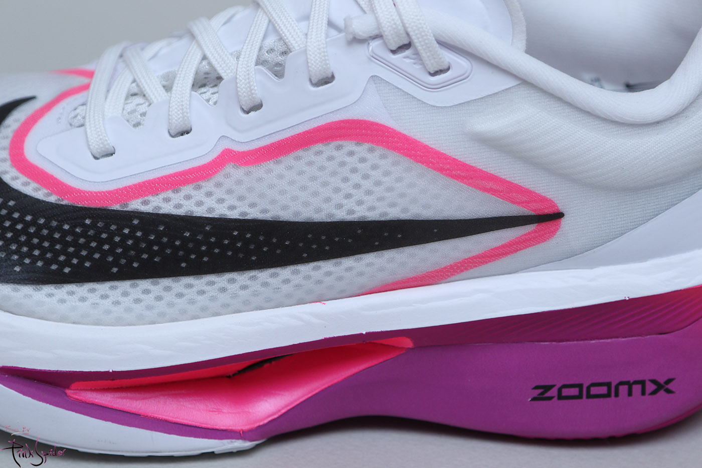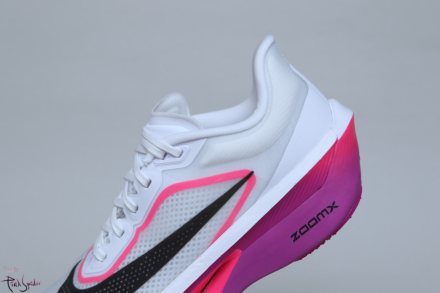 상단에는 비비드 그레이프 컬러로 나이키 로고와 줌플라이 로고가 프린팅 되어 있고