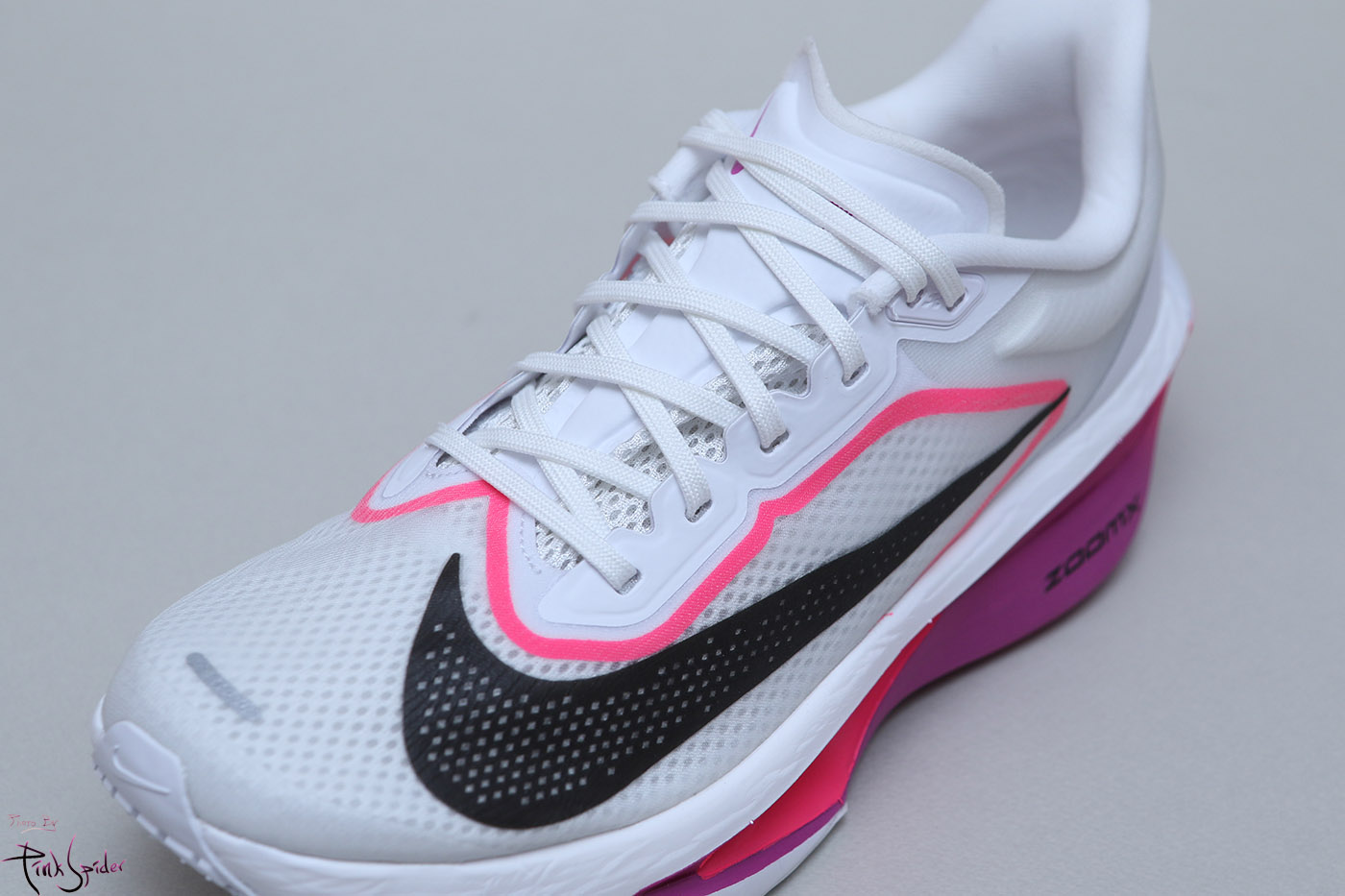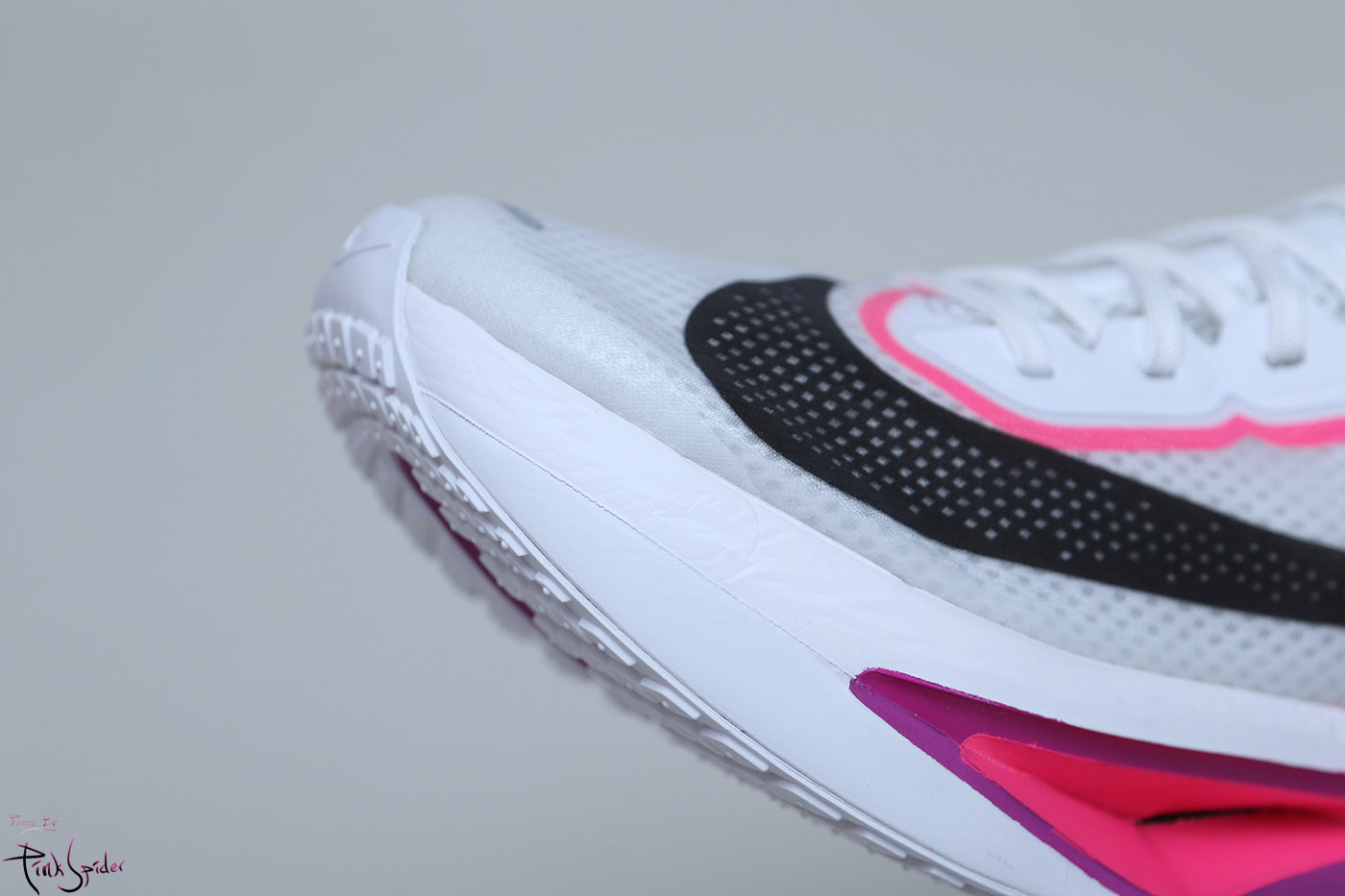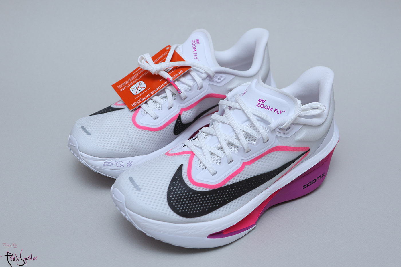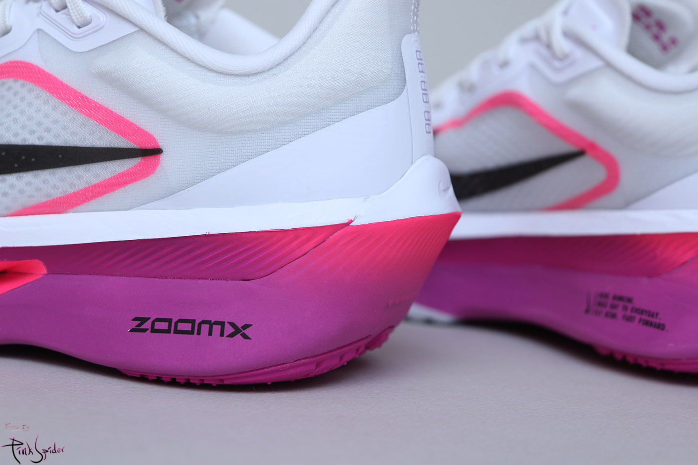 상단에는 비비드 그레이프 컬러로 나이키 로고와 줌플라이 로고가 프린팅 되어 있고