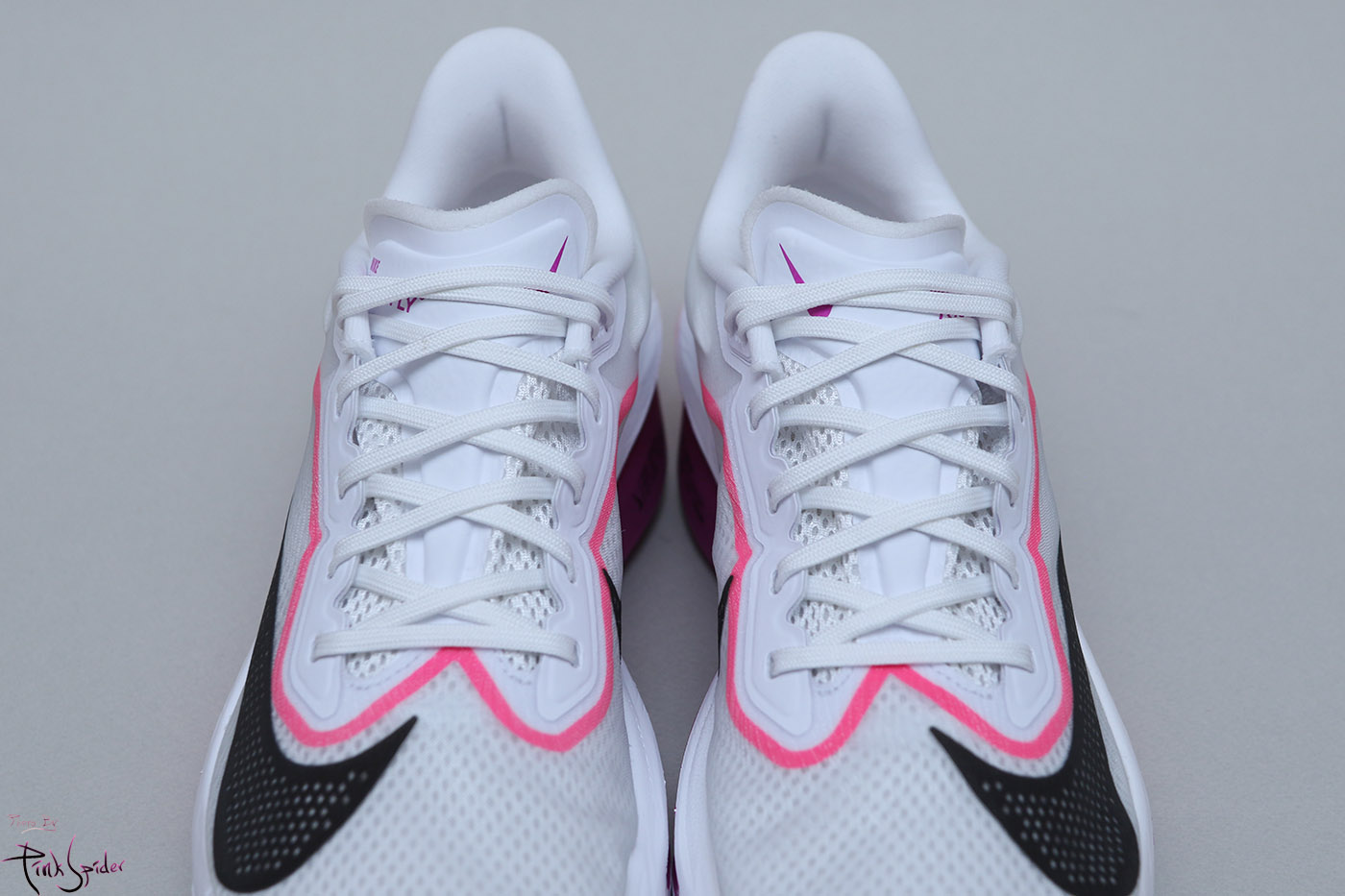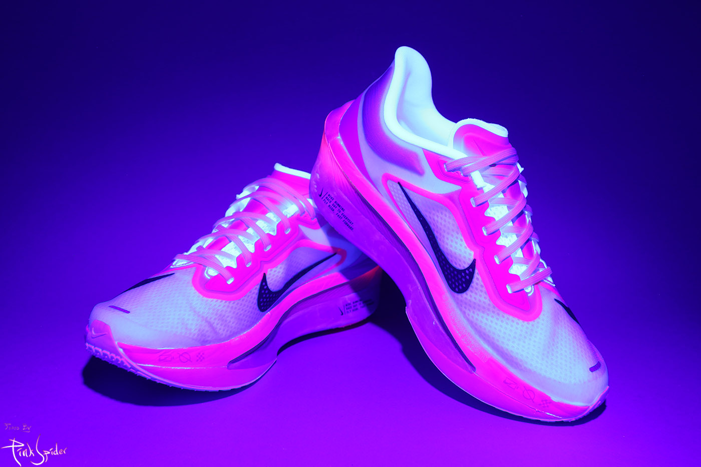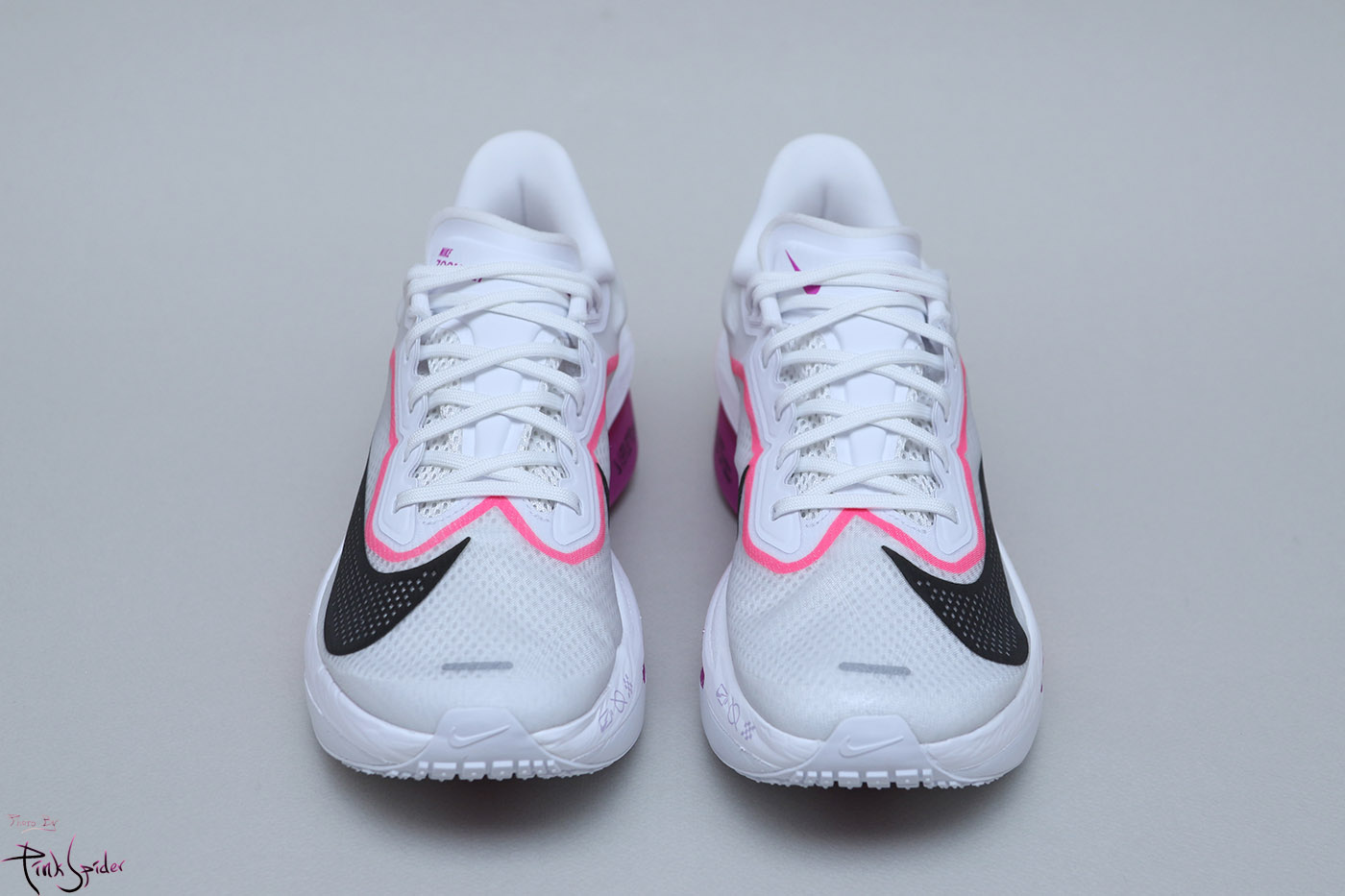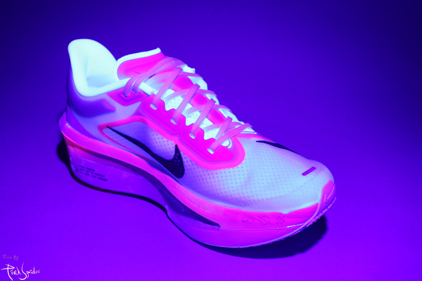 상단에는 비비드 그레이프 컬러로 나이키 로고와 줌플라이 로고가 프린팅 되어 있고