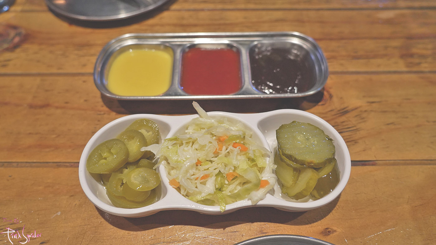 주문한 메뉴들과 곁들여서 먹을 피클류랑 슈바인학센을 찍어 먹을 소스를 먼저 내어준다.