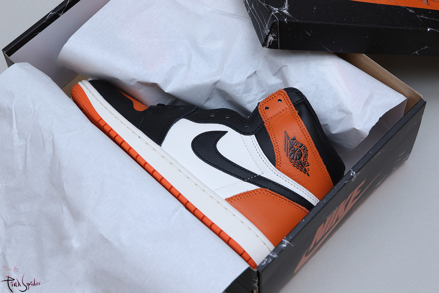 박스는 기존 조던1의 박스이지만 백보드가 깨져 있는 그래픽이 추가되었다.