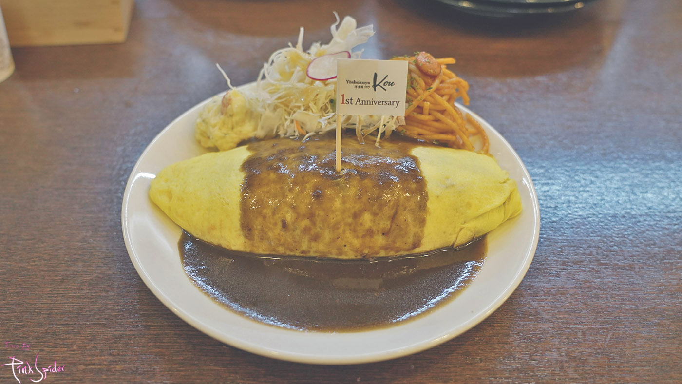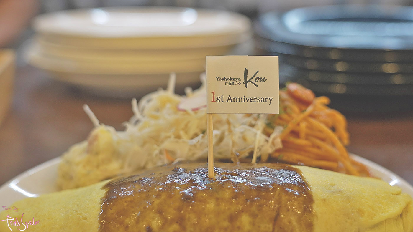오므라이스 위에 이렇게 요쇼쿠야 코우 1주년 기념 깃발도 올려져 있고