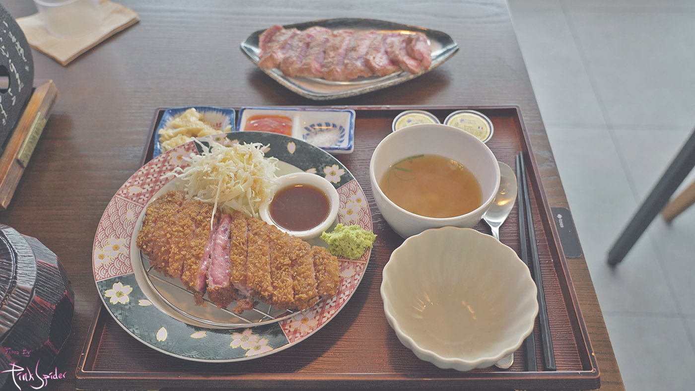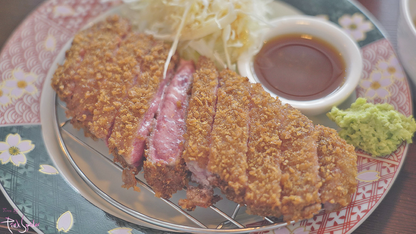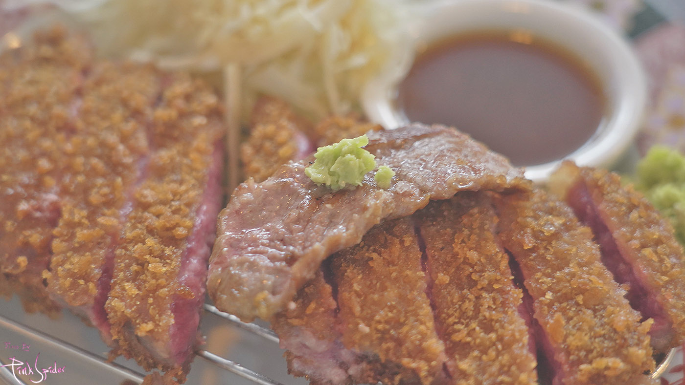 스테키 고기는 보통 규카츠와는 다르게 튀김옷이 없고 겉면은 적당하게 익히고 거의 레어로 나온다.