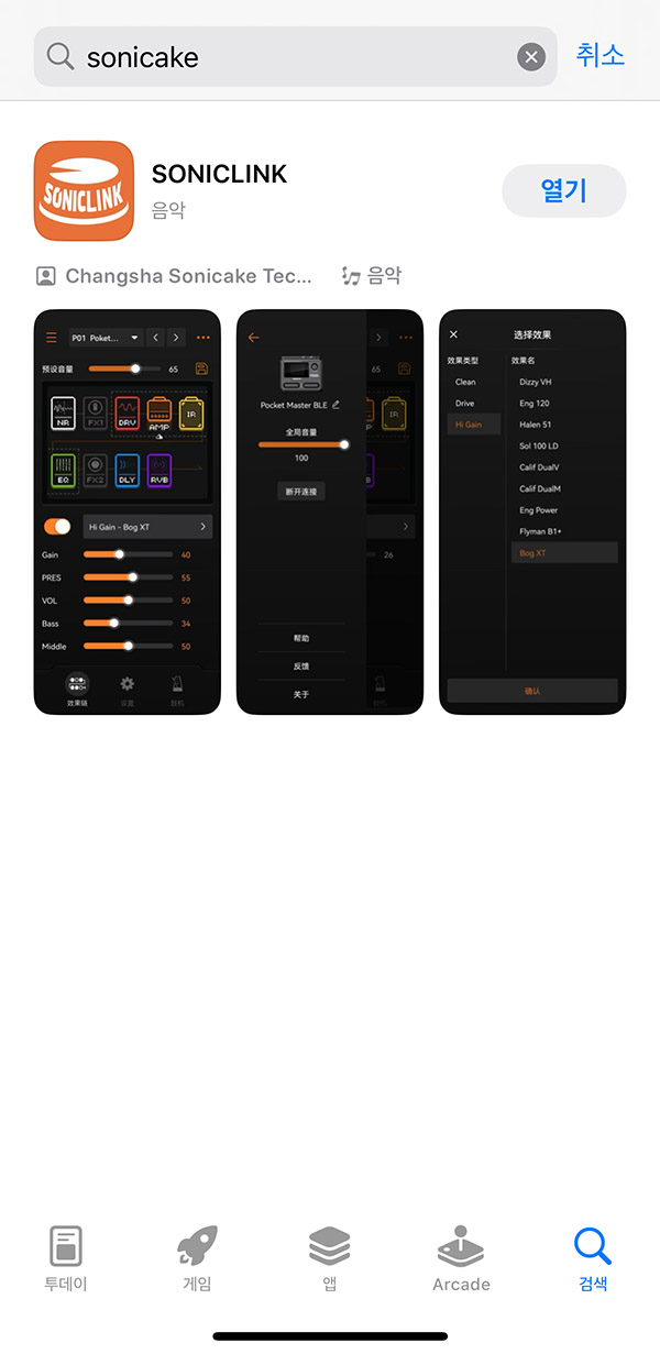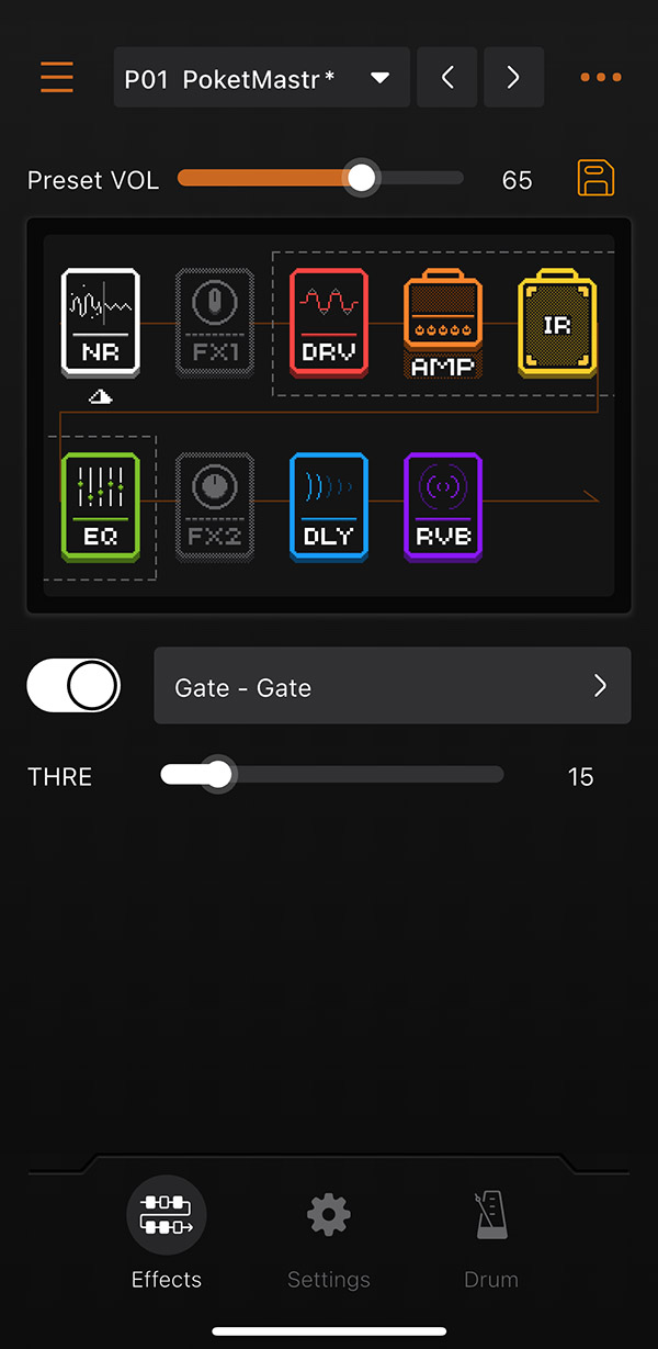 블루투스를 켜고 QME-10을 연결하고 어플을 실행하면 바로 이렇게 이펙터를 볼 수 있어서 확실히 편함