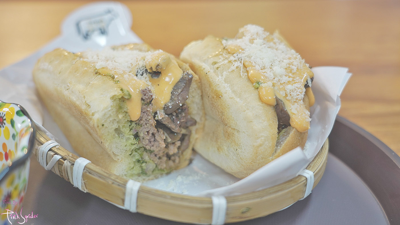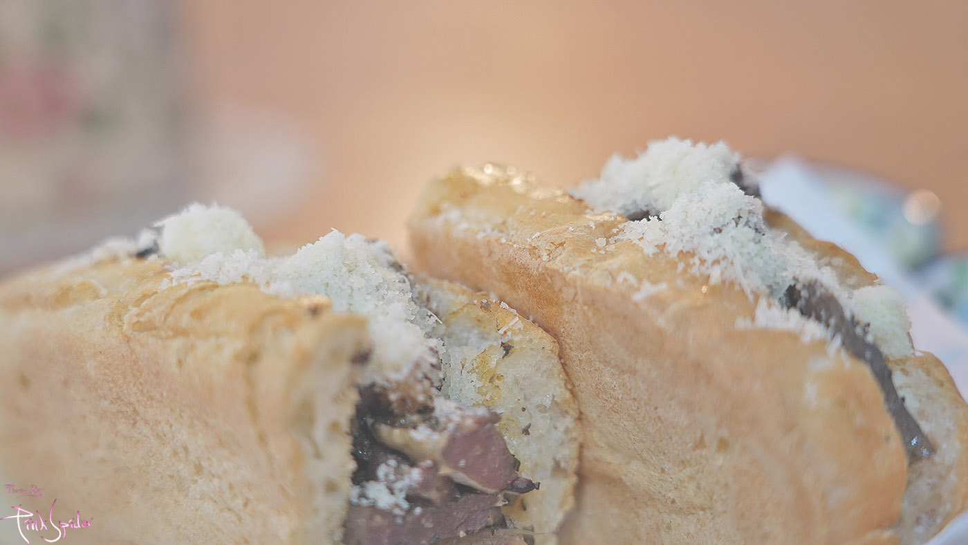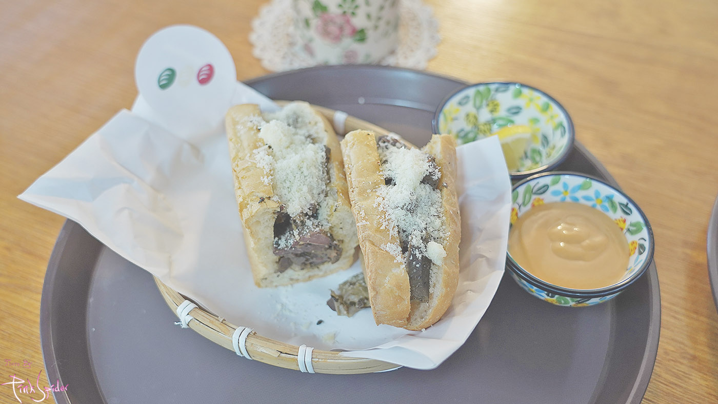 소의 양과 허파만 들어간 내용물에 바삭하게 구운 바게트 샌드위치 그리고 위에 치즈가 듬뿍 뿌려진 샌드위치다~