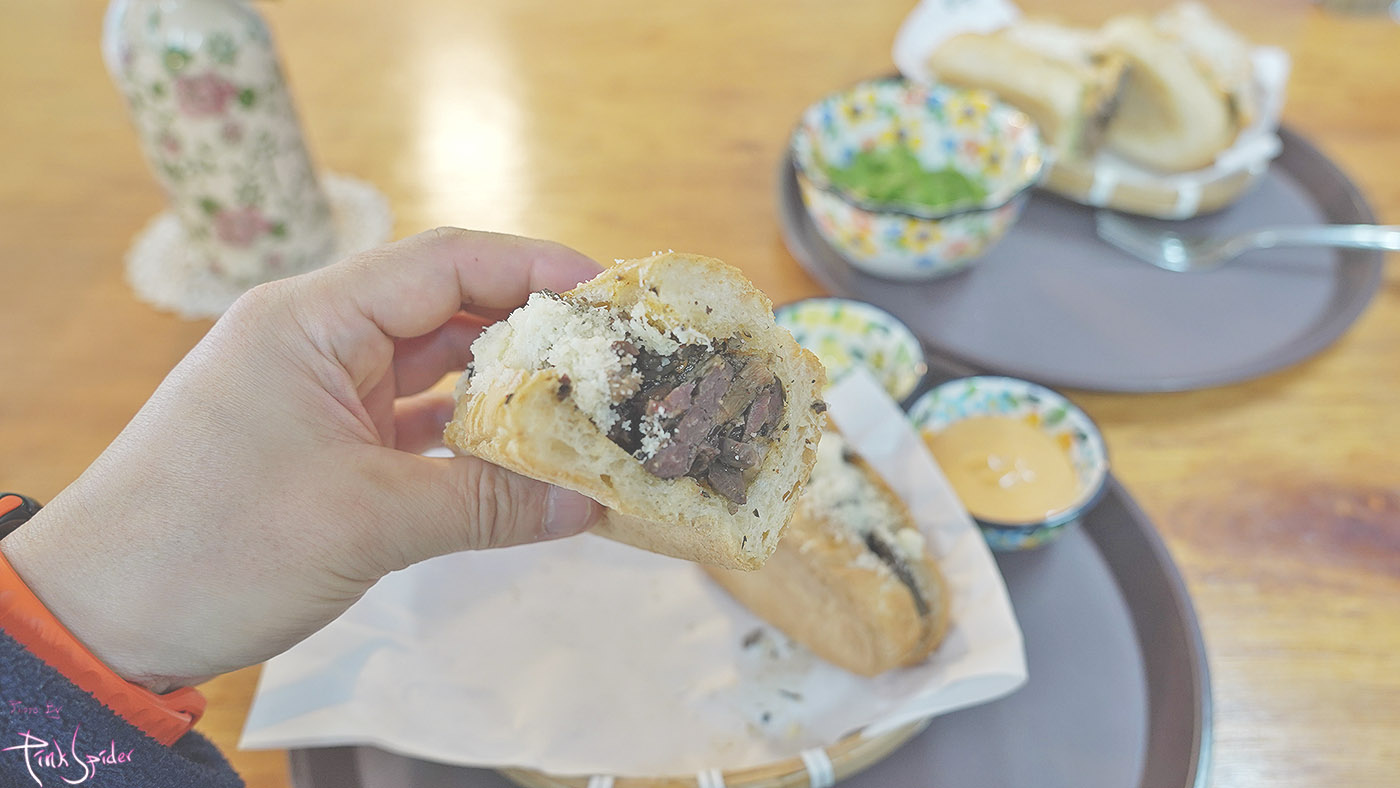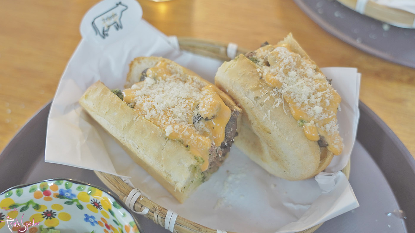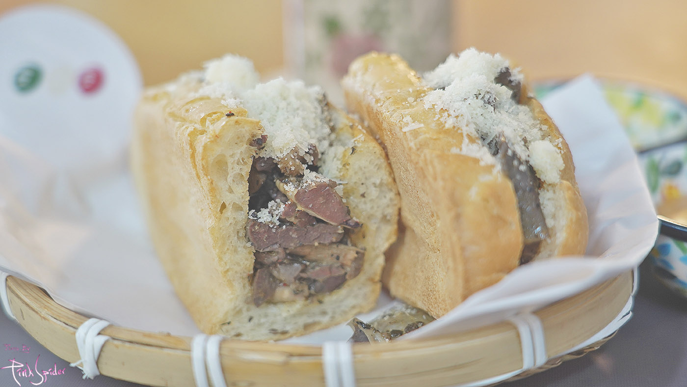 소의 양과 허파만 들어간 내용물에 바삭하게 구운 바게트 샌드위치 그리고 위에 치즈가 듬뿍 뿌려진 샌드위치다~