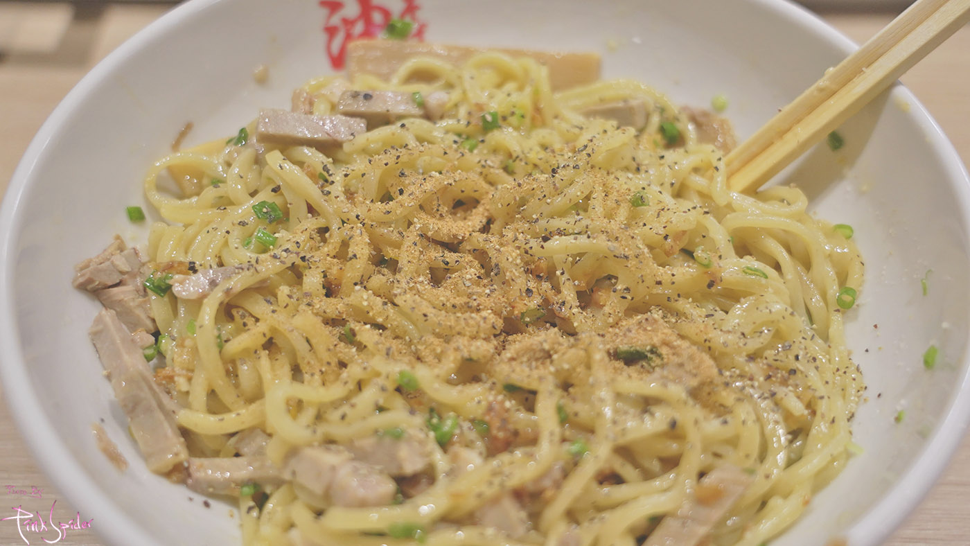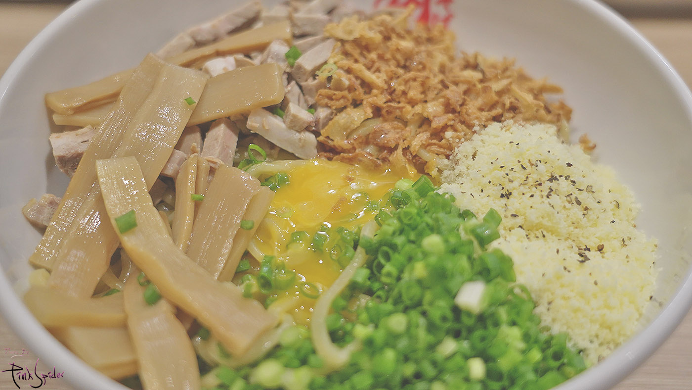 아부라소바 C토핑(기본 아부라소바 + 파마산치즈 + 고기추가 + 튀긴양파 + 노른자)으로 주문하고