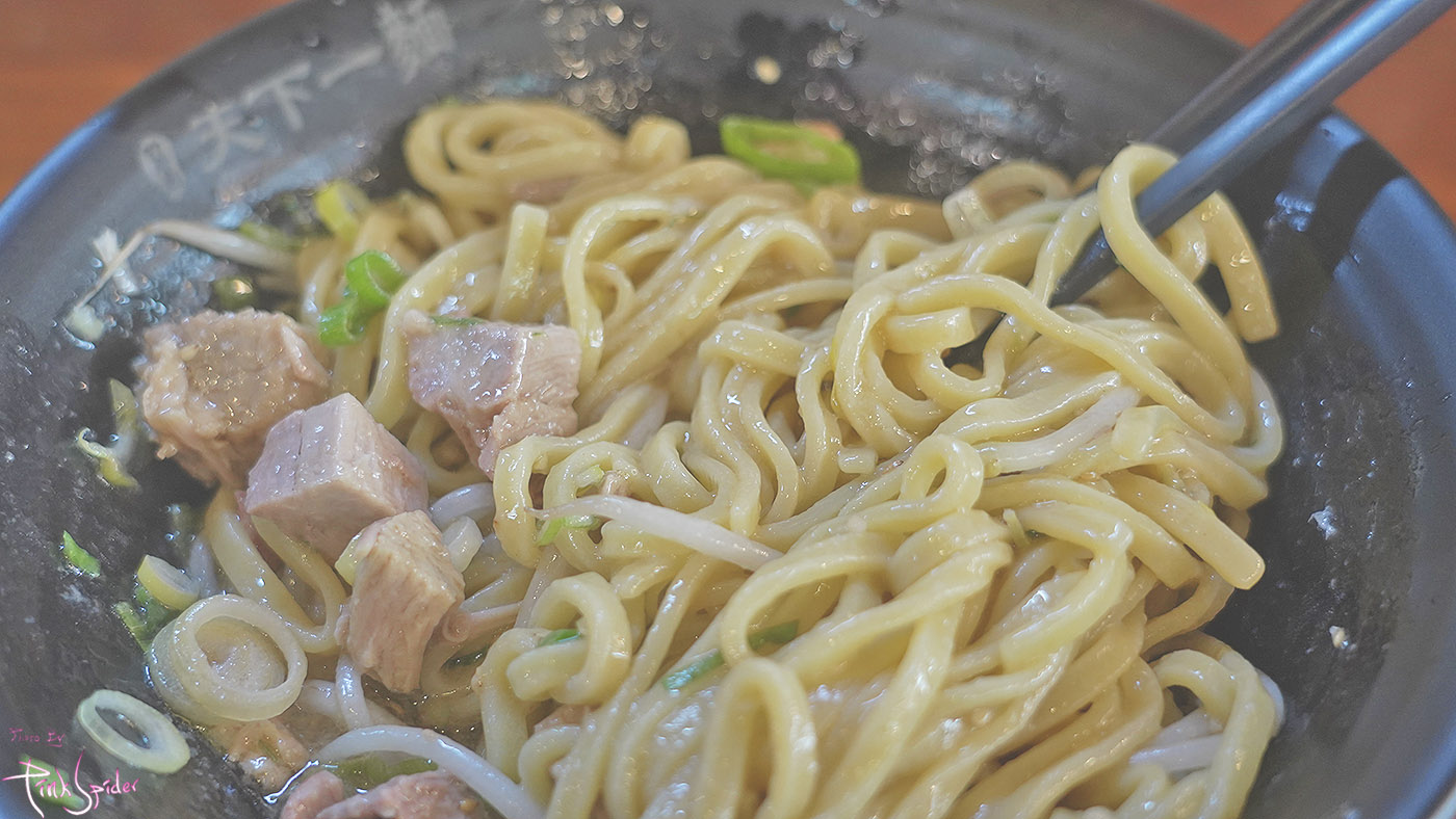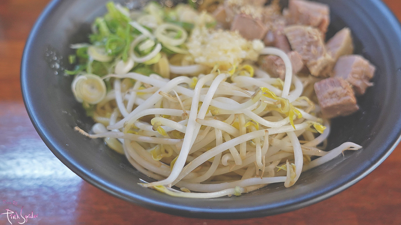 그리고 숙주를 슬쩍 들춰내면 아래에 아부라와 아부라소바 특유의 굵은 면이 적당히 아부라에 잠겨 있었음