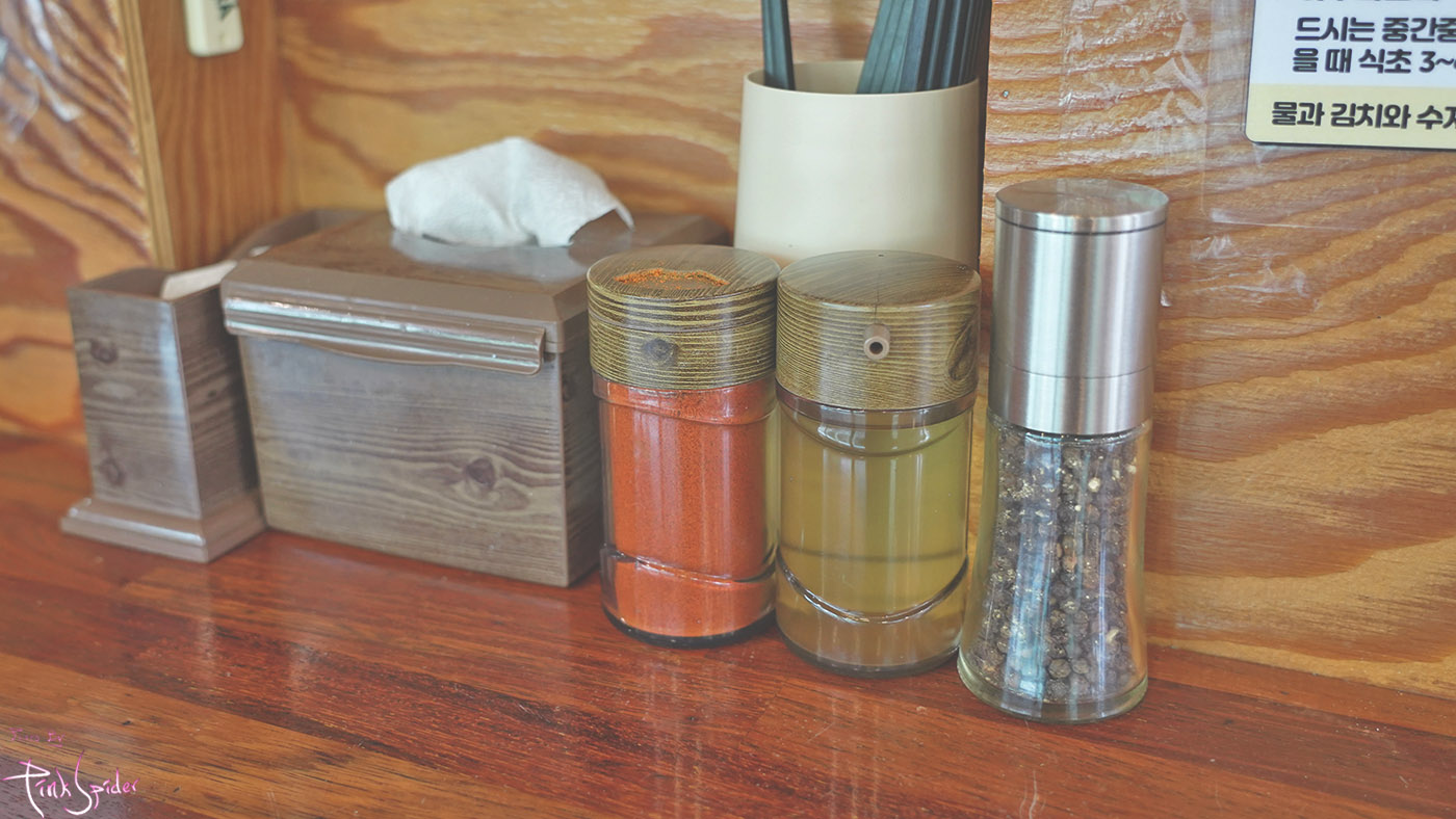 테이블에는 고춧가루, 식초 그리고 굵은 후추가 있었는데