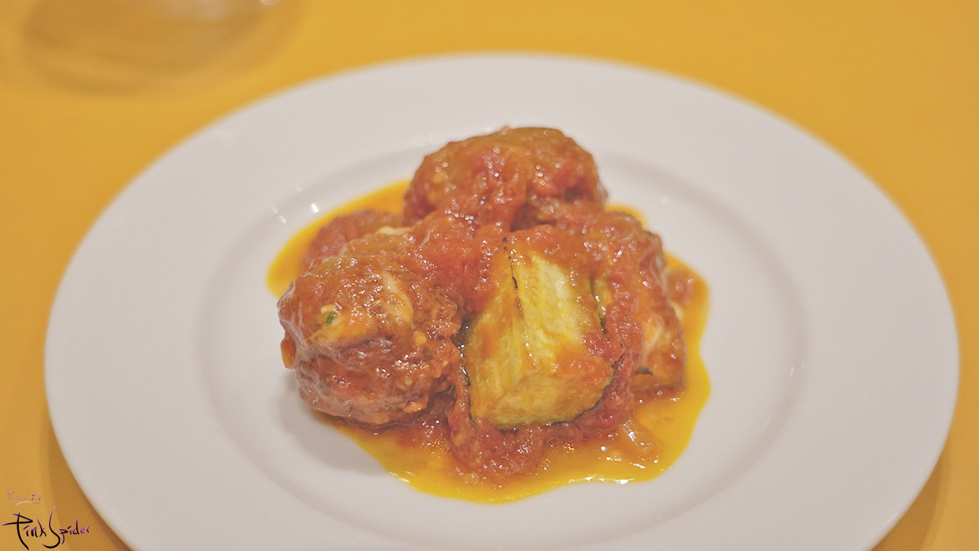 토마토소스을 얹은 미트볼 느낌에 가지가 들어 있어서 무겁자 않은 맛이었다.